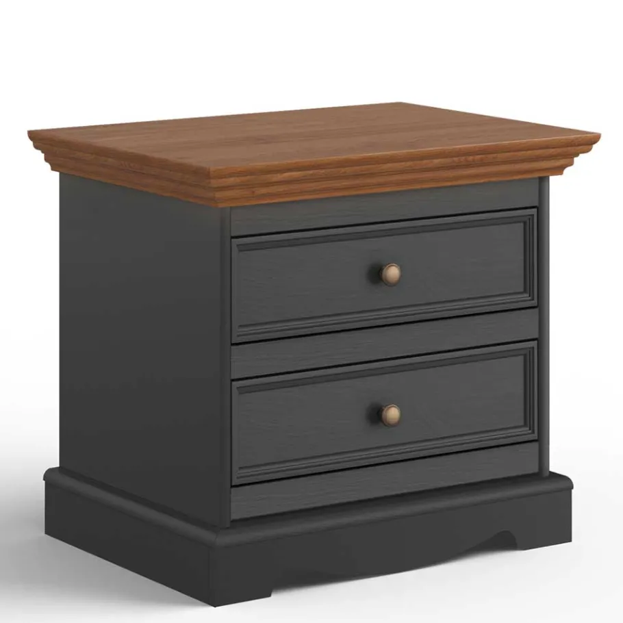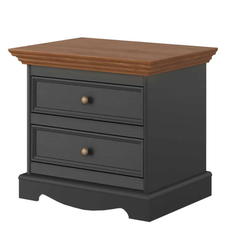 Unsere Nachtkommode „Witenga“ wird aus massivem Kiefernholz gefertigt, das für seine Langlebigkeit und natürliche Schönheit bekannt ist. Kiefernholz zeichnet sich durch seine charakteristische Maserung aus, die durch die graue Lackierung (RAL7012) mit 85% Deckkraft dezent durchscheint. Dies verleiht dem Möbelstück eine harmonische und warme Ausstrahlung, während die Eichefarben der Deckplatte für einen reizvollen Kontrast sorgen.