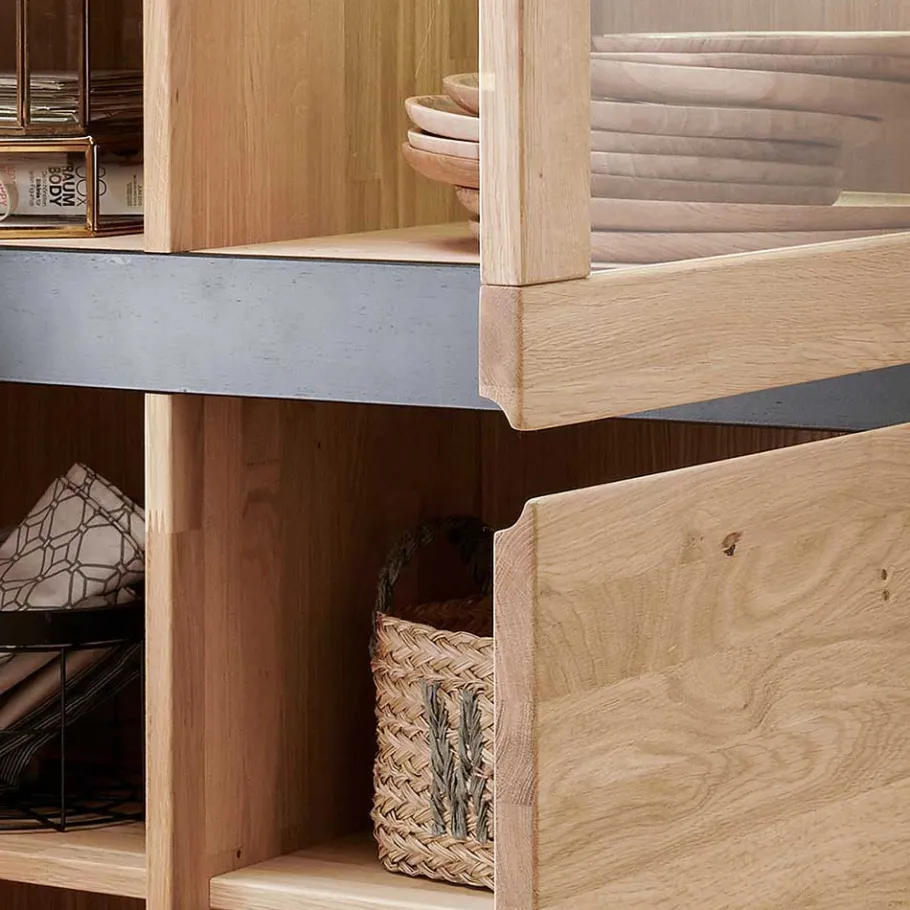 Zu den funktionellen Merkmalen der hochwertigen Massivholzmöbel gehören gedämpfte Türen mit Metallbeschlägen (Türanschlag rechts) sowie Soft-Close-Schubladen auf Vollauszügen aus Metall.