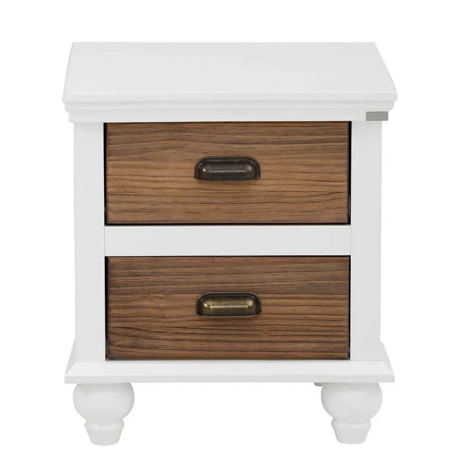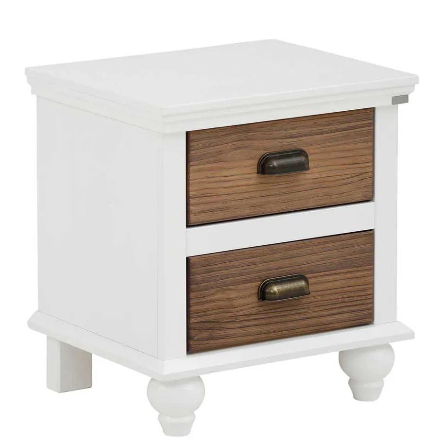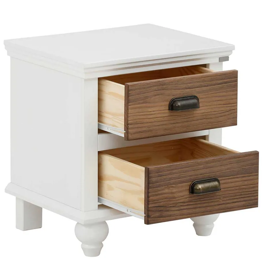 Die Nachtkommode bietet mit zwei geräumigen Schubladen ausreichend Platz für Ihre Utensilien. Die Schubladenfronten in warmem Kiefernholz Braun setzen einen schönen Kontrast zum weißen Korpus und verleihen der Kommode ihren einzigartigen Charme. Dank der Metallauszüge gleiten die Schubladen sanft und zuverlässig, während die Muschelgriffe aus Altmessing einen zusätzlichen Hauch von Nostalgie hinzufügen.