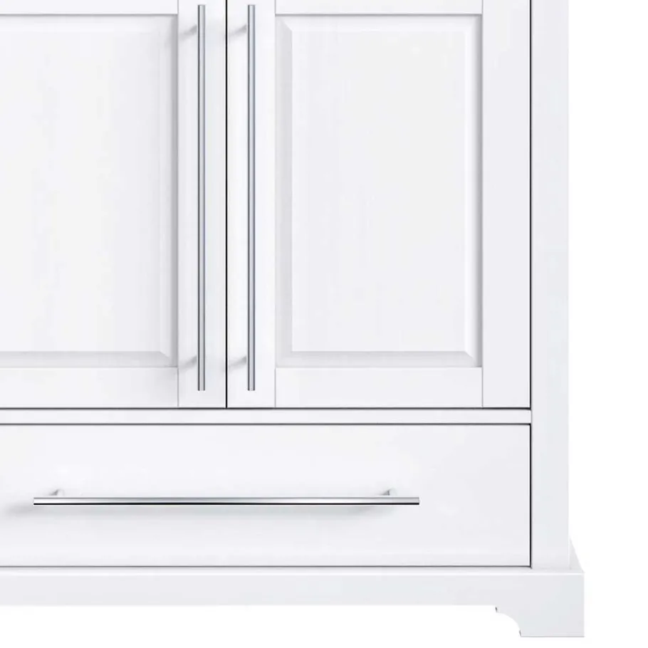 Die elegante Rückwand aus Hartfaserplatte sorgt für Stabilität und rundet das Gesamtbild ab. Die Metall-Stangengriffe in Chromfarben fügen sich harmonisch in das Design ein und bieten eine komfortable Handhabung. Das formschöne, nach vorne teiloffene Sockelgestell verleiht der Vitrine eine leichte und moderne Optik. Aus Sicherheitsgründen empfehlen wir eine zusätzliche Kippsicherung.