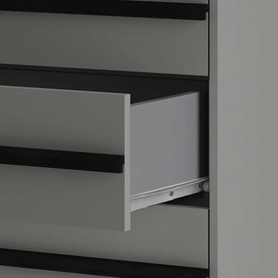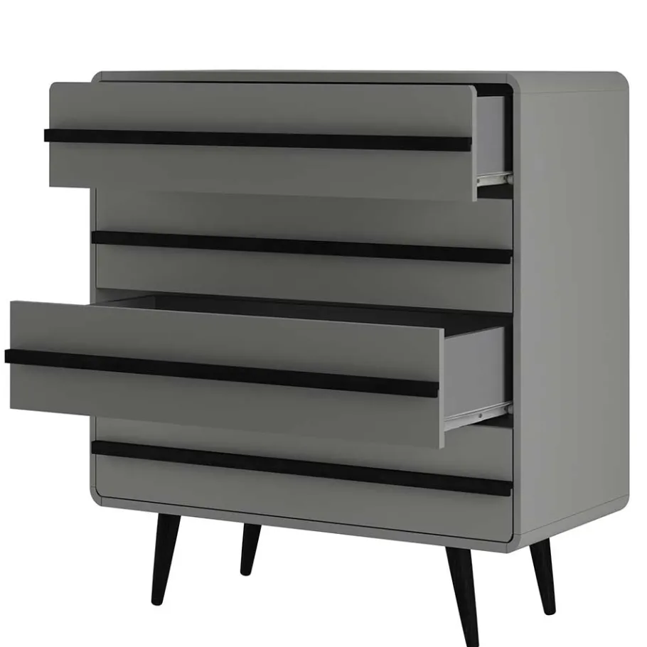 Mit vier geräumigen Schubladen, die sich dank der stabilen Metallauszüge leichtgängig öffnen und schließen lassen, bietet „Pavias“ jede Menge Platz für Kleidung, Dokumente oder Accessoires. Die schwarzen MDF-Griffleisten fügen sich dezent in das Gesamtbild ein und sorgen für eine angenehme Bedienung.