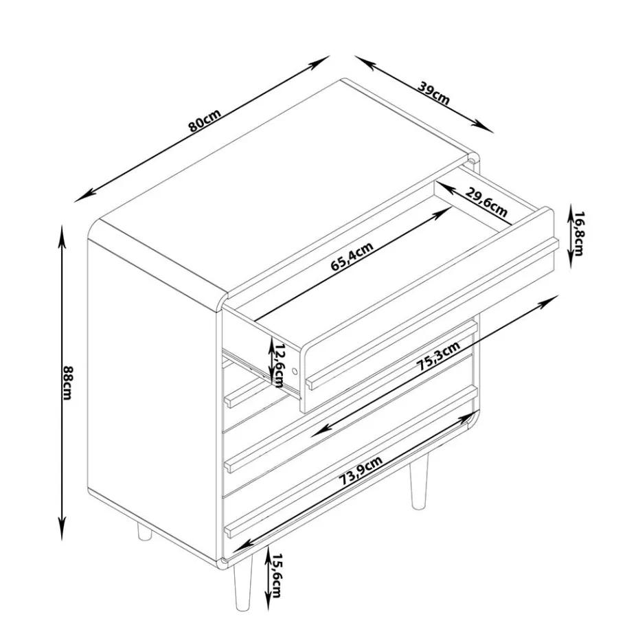 Mit einer Breite von 80 cm, einer Höhe von 88 cm und einer Tiefe von 39 cm bietet die Kommode großzügigen Stauraum, ohne viel Platz zu beanspruchen. Ihr Gewicht von ca. 33,3 kg sorgt für einen stabilen Stand, wobei eine Kippsicherung für die Wandmontage erforderlich ist.