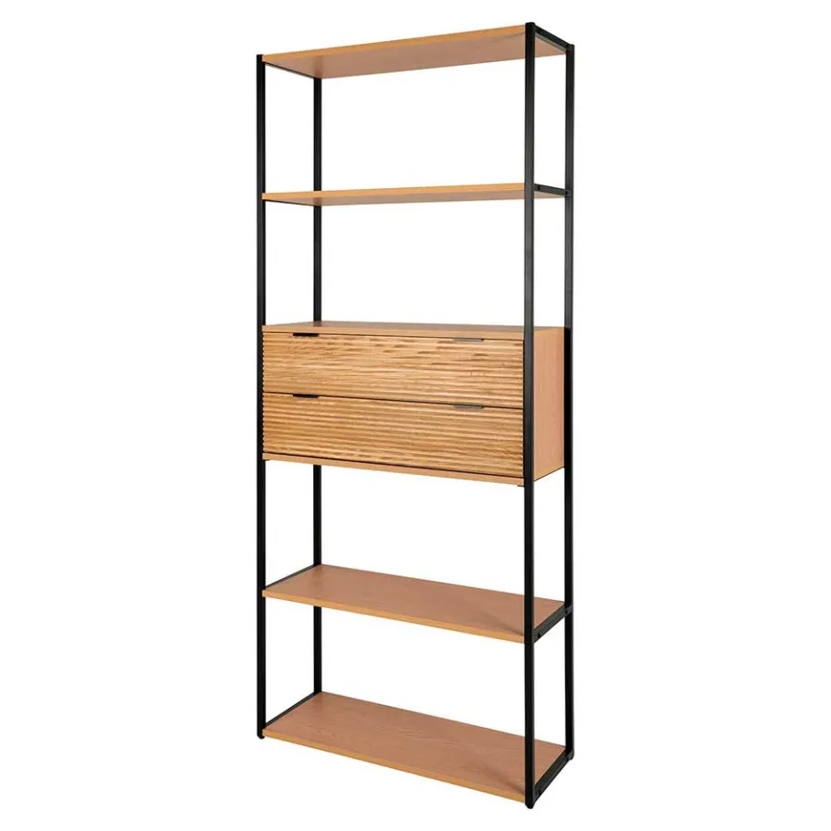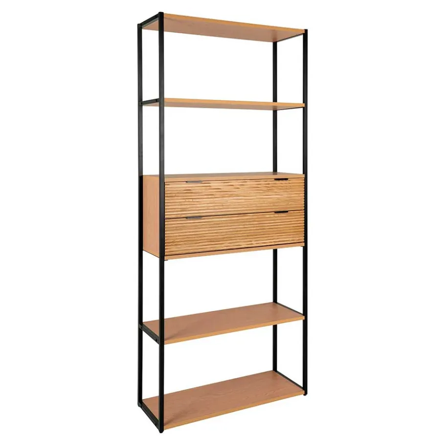 Das Regal „Lennilia“ überzeugt durch seine sorgfältige Verarbeitung und die Verwendung edler Materialien. Die Oberflächen des Holzwerkstoffs sind mit Echtholzfurnier und Lack versehen, wodurch sie besonders pflegeleicht und strapazierfähig sind. Das Metallgestell sorgt für eine stabile Konstruktion und verleiht dem Regal gleichzeitig einen industriellen Touch. Die zwei Schubladen sind mit robusten Metallauszügen ausgestattet und bieten zusätzlichen Stauraum für kleinere Gegenstände.