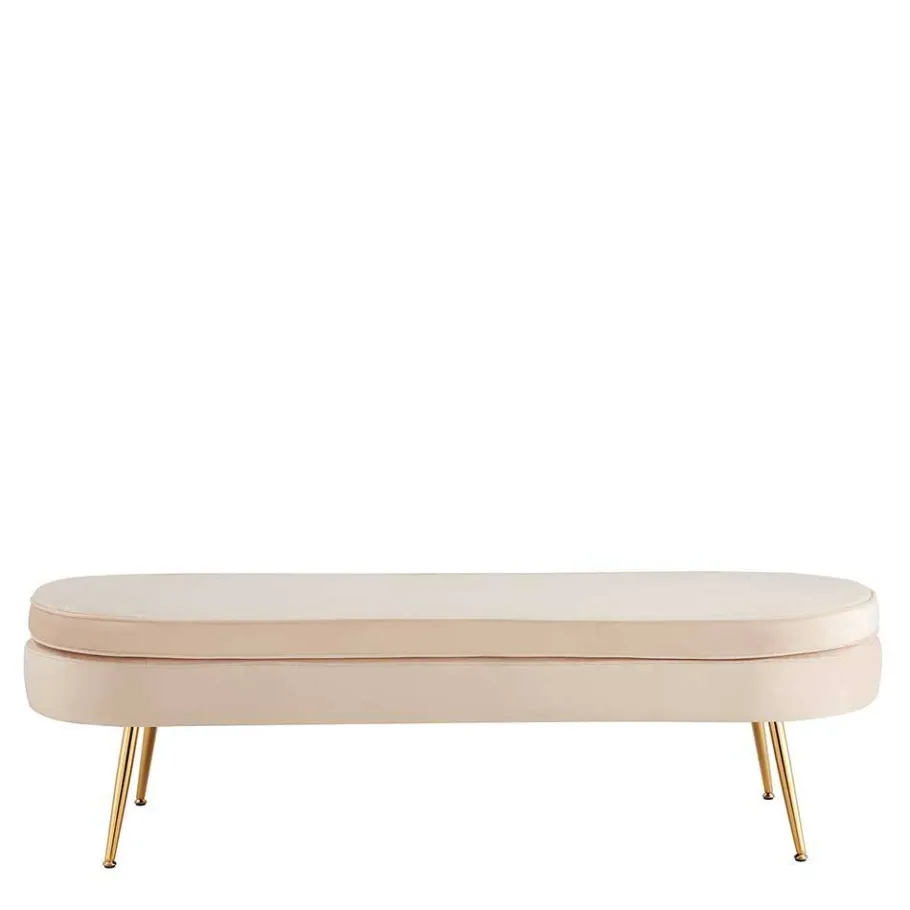 Die Farbkombination aus warmem Beige und luxuriösem Gold verleiht der Polsterbank eine edle, einladende Ausstrahlung. Der Bezug aus hochwertigem Samt in sanftem Beigeton unterstreicht die harmonische Optik, während das goldfarbig verchromte Metallgestell das Design raffiniert akzentuiert. Leicht abgespreizte Füße sorgen für ein fein abgestimmtes, luftiges Erscheinungsbild – ein echter Hingucker, der dennoch nicht aufdringlich wirkt.
