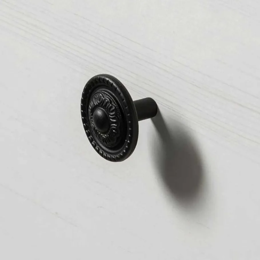 - Klassische Knopfgriffe und rustikale Stangengriffe aus Metall in Schwarz