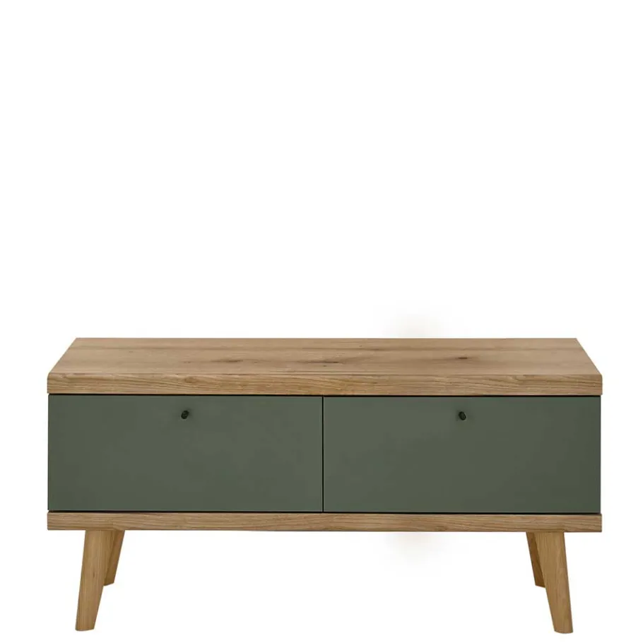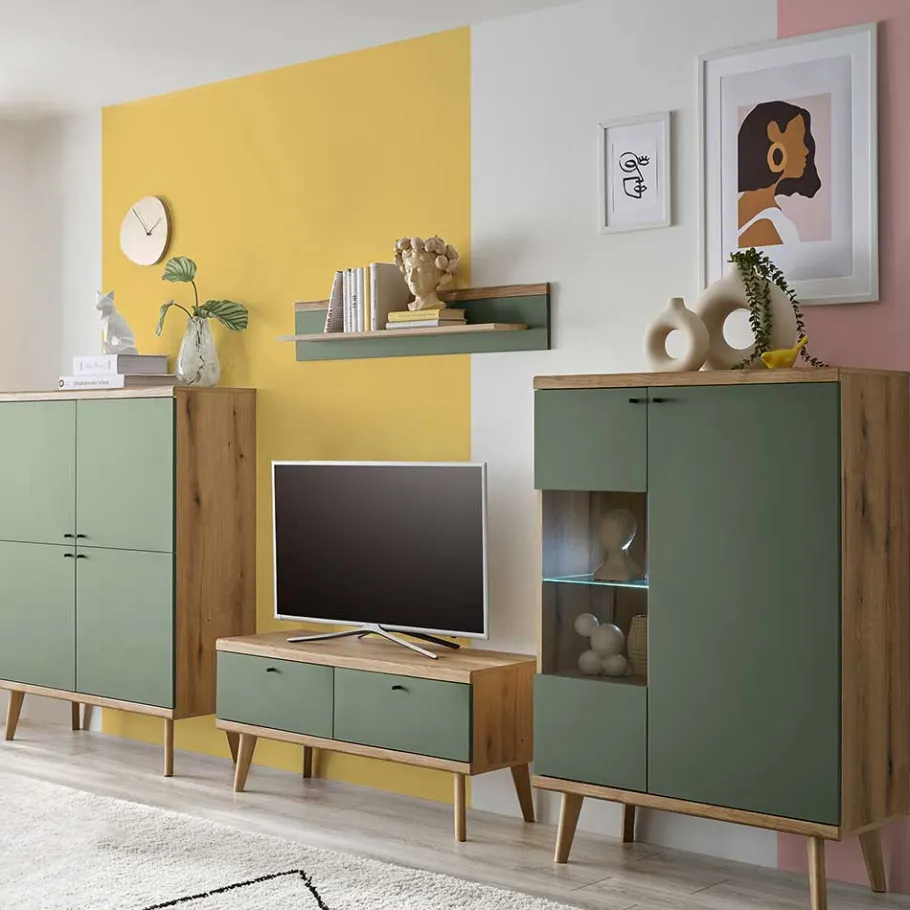 Die Wohnwand „Oliva“ überzeugt durch eine trendstarke Farbkombination aus Graugrün und Wildeichefarben. Diese Farbwahl schafft ein modernes und gleichzeitig warmes Ambiente, das sich perfekt in diverse Wohnkonzepte integrieren lässt. Die Kombination aus Holzwerkstoff für Korpusse und Fronten sowie Massivholz für die Vierfußgestelle stellt sicher, dass Sie ein Möbelstück erhalten, das sowohl optisch als auch qualitativ höchsten Ansprüchen gerecht wird.