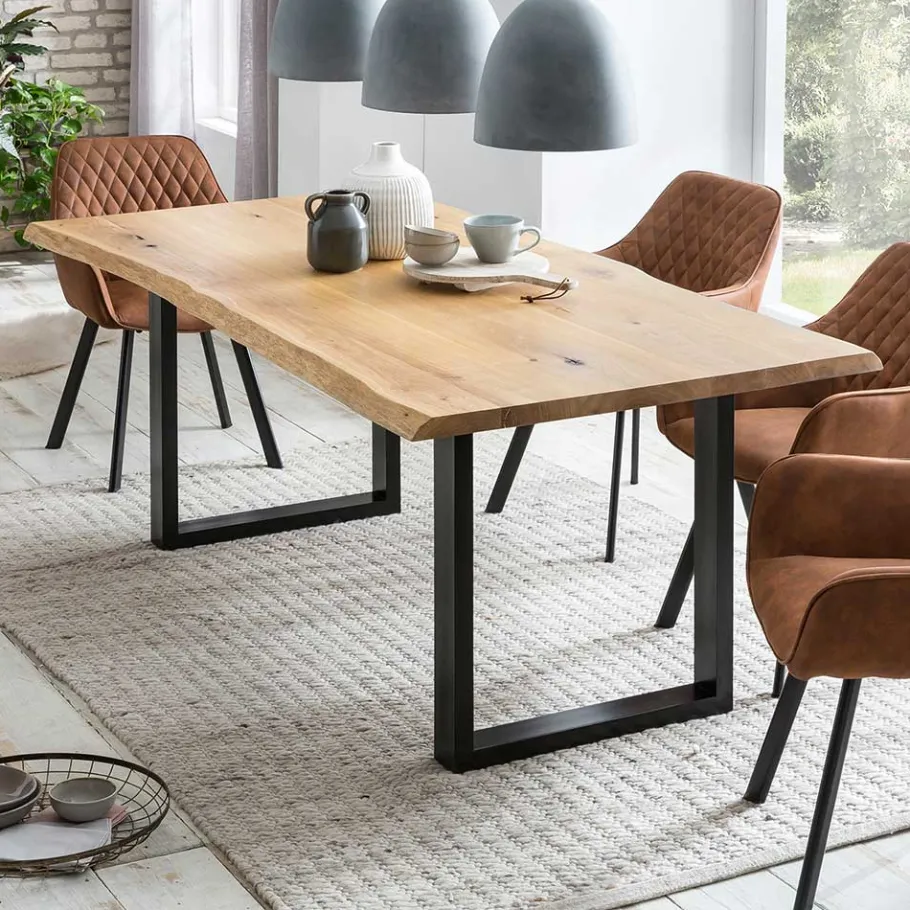 Der Esstisch Selvina ist ein echtes Schmuckstück für jedes Zuhause. Hergestellt aus massiver Eiche und Metall, ist er robust und pflegeleicht. Die Massivholzoberfläche ist klar, das Metallgestell ist in Schwarz lackiert und schafft eine einladende Atmosphäre im Esszimmer oder in der Küche.