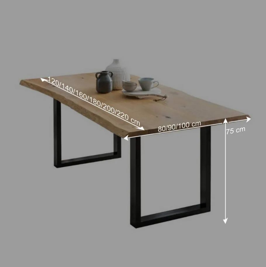 Die rustikalen, organischen Baumkanten machen jedes Möbelstück zu einem Unikat und laden zum Verweilen ein. Die Tiefe des Tisches variiert, da die Platten aus dem Baum geschnitten werden, wodurch jedes Möbelstück einzigartig ist. Die robuste Tischplattenstärke beträgt ca. 4 cm und das stabile Metall-Bügelgestell sorgt für Stabilität.