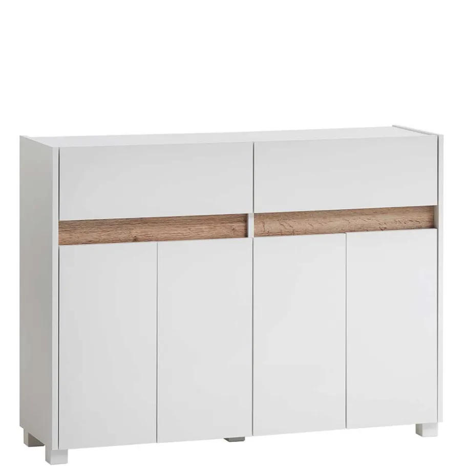 Mit seinen Maßen von 112,2×84,8×33 cm überzeugt das Sideboard als wahres Organisationstalent. Vier Türen verbergen zwei große Fächer mit je einem verstellbaren Einlegeboden. Zwei Schubladen (je 50x15x26 cm Innenmaß) bieten zusätzlichen Stauraum für kleinere Utensilien. Der mittig platzierte Stützfuß sorgt für zusätzliche Stabilität. Die Fachinnenmaße ohne Böden betragen je ca. 53,7x60x29 cm.