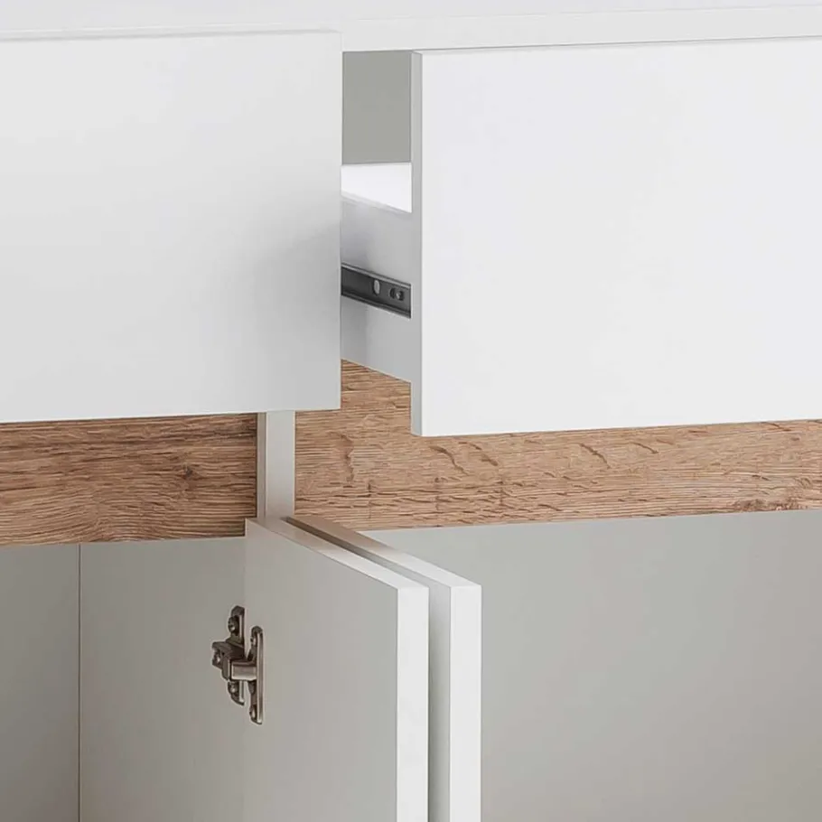 Tür- und Schubladenöffnungen kommen ganz ohne Griffe aus – die grifflose Technik sorgt für ein ruhiges, klares Erscheinungsbild. Alle Schubladen sind mit langlebigen Metallauszügen ausgestattet, Türen laufen stabil auf soliden Metallbeschlägen. Die Verarbeitung ist durchweg hochwertig und auf lange Lebensdauer ausgelegt.