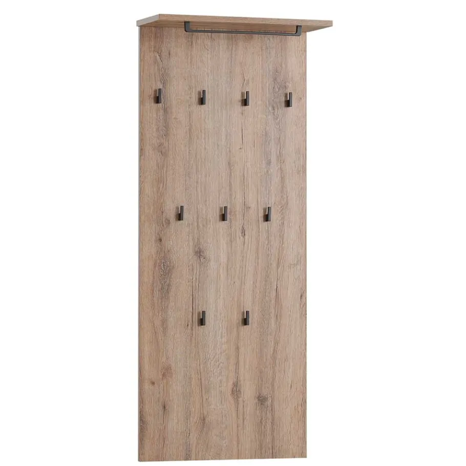 Mit den Maßen 50×110,6×20,9 cm bietet das Paneel trotz seiner schlanken Form erstaunlich viel Funktionalität. Die stabile Rückwand trägt eine praktische Hutablage (50×20 cm), darunter eine Kleiderstange sowie neun versetzt angeordnete Metallhaken – ideal für Jacken, Taschen und Co.