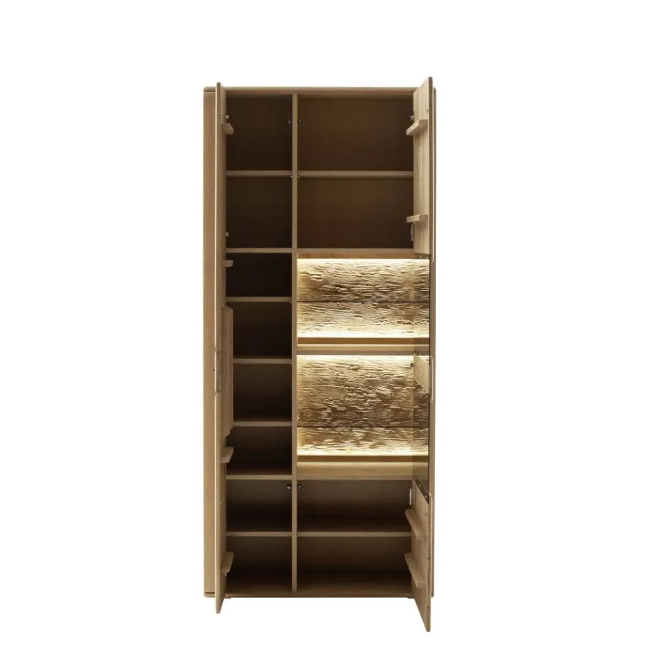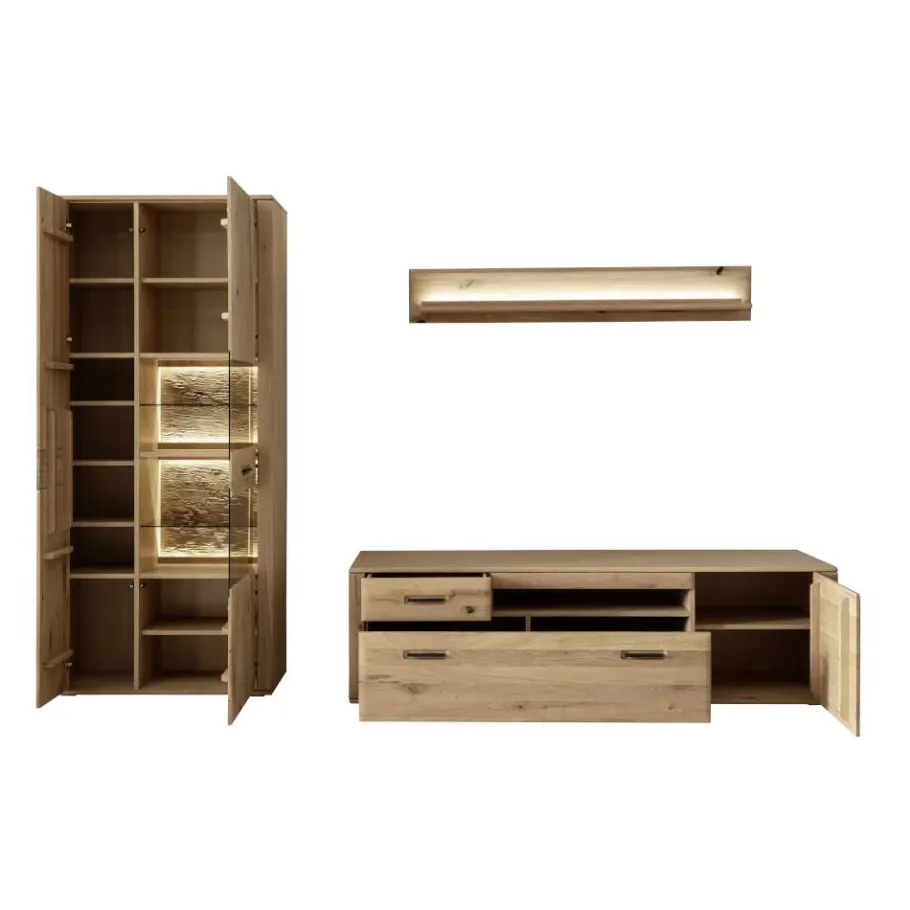 Das Set besteht aus einem geräumigen TV-Lowboard, einem großzügigen Vitrinenschrank und einem passenden Wandboard – alle Elemente harmonieren perfekt miteinander und bieten sowohl stilistische als auch funktionale Vorteile für Ihr Wohnzimmer. Dabei sorgt die integrierte LED-Beleuchtung mit Memory-Funktion und Funkfernbedienung für atmosphärische Lichtakzente. Die charakteristische Holzmaserung der Asteiche harmoniert hervorragend mit den modernen Griffleisten in Anthrazit und den flachen Holzfüßen.