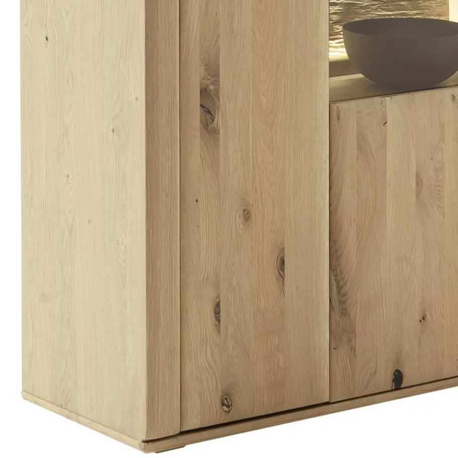 - Teilmassiv aus Ast-, Balkeneiche Massivholz mit durchgehender Lamelle (Front) und Spanplatte (Korpus) gefertigt
