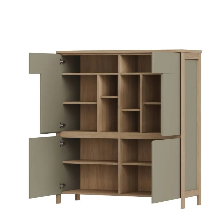 Das Highboard mit 111 cm Breite, 125 cm Höhe und 39 cm Tiefe bietet hinter vier Drehtüren insgesamt sechs Einlegeböden. Die oberen Türen sind dekorativ ausgeschnitten, wodurch vier offene Fächer entstehen – perfekt für kleine Dekoobjekte oder persönliche Lieblingsstücke. Gewicht: ca. 63 kg.