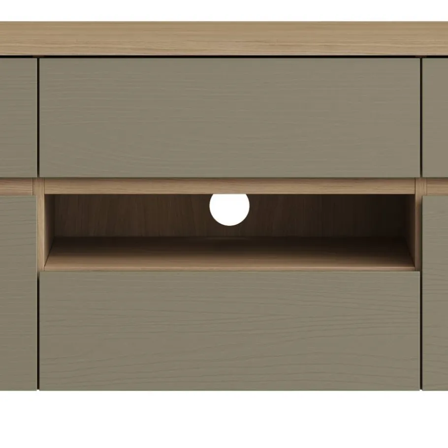Mit Maßen von 164 cm Breite, 58 cm Höhe und 39 cm Tiefe bietet das TV-Board Platz für Ihre Unterhaltungselektronik und Zubehör. Vier Schubladen, zwei Drehtüren und ein offenes Gerätefach sorgen für Ordnung. Die Rückwand ist mit einer runden Öffnung versehen – für eine saubere Kabelführung. Hinter den Türen befindet sich jeweils ein Fach. Gewicht: ca. 49 kg.