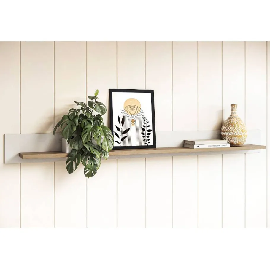 Das Wandboard (B/H/T: 180x17x17 cm) ergänzt die Anbauwand perfekt. Mit einer Ablagefläche von 16 cm Tiefe und einer maximalen Belastbarkeit von 3 kg bietet es Platz für Bilderrahmen, Pflanzen oder Bücher. Mit einem Gewicht von 8,5 kg lässt sich das Board leicht anbringen und rundet das Ensemble optisch ab.