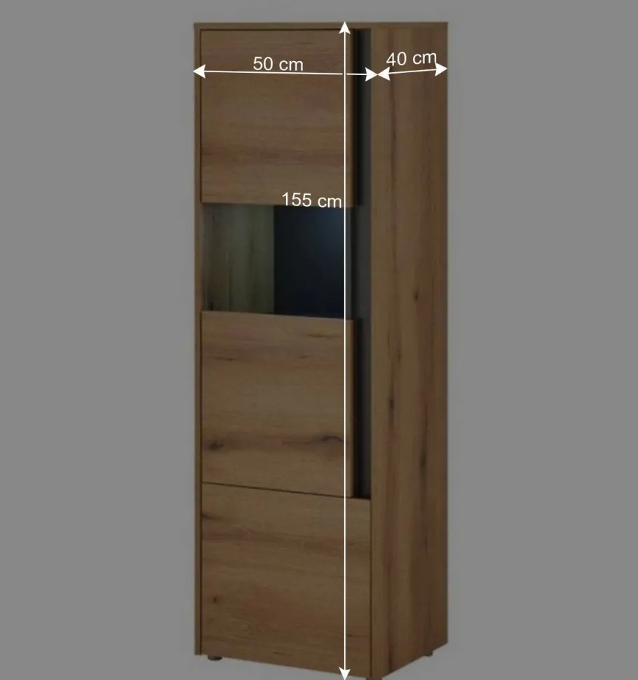 Niedrige Vitrine Mit den Maßen 50x155x40 cm (BxHxT) bietet die niedrige Vitrine „Colomania“ eine kompakte Stauraumlösung mit eleganter Optik. Sie verfügt über zwei Türen, wobei die obere Tür mit einem mittigen Glaseinsatz versehen ist. Dahinter befinden sich drei offene Fächer mit den Innenmaßen 46x38x36 cm, 46x36x36 cm und 46x36x32 cm. Drei Einlegeböden sind jeweils bis zu 5 kg belastbar. Der Türanschlag ist beidseitig montierbar. Auch hier sorgen die zurückgesetzten Blenden in Anthrazit für eine grifflose Optik. Die Vitrine steht auf flachen Möbelgleitern und sollte zur Kippsicherung an der Wand befestigt werden.