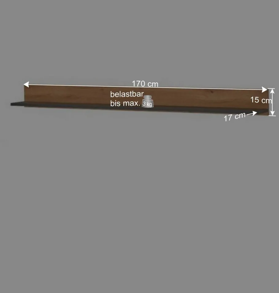 Hängeboard Das Hängeboard misst 170x15x17 cm (BxHxT) und bietet eine farblich abgesetzte Ablagefläche in Anthrazit mit einer Tiefe von 15 cm. Die maximale Belastbarkeit beträgt 3 kg – ideal für leichte Dekorationselemente oder Bilderrahmen. Die Wandmontage sorgt für eine luftige, moderne Optik.