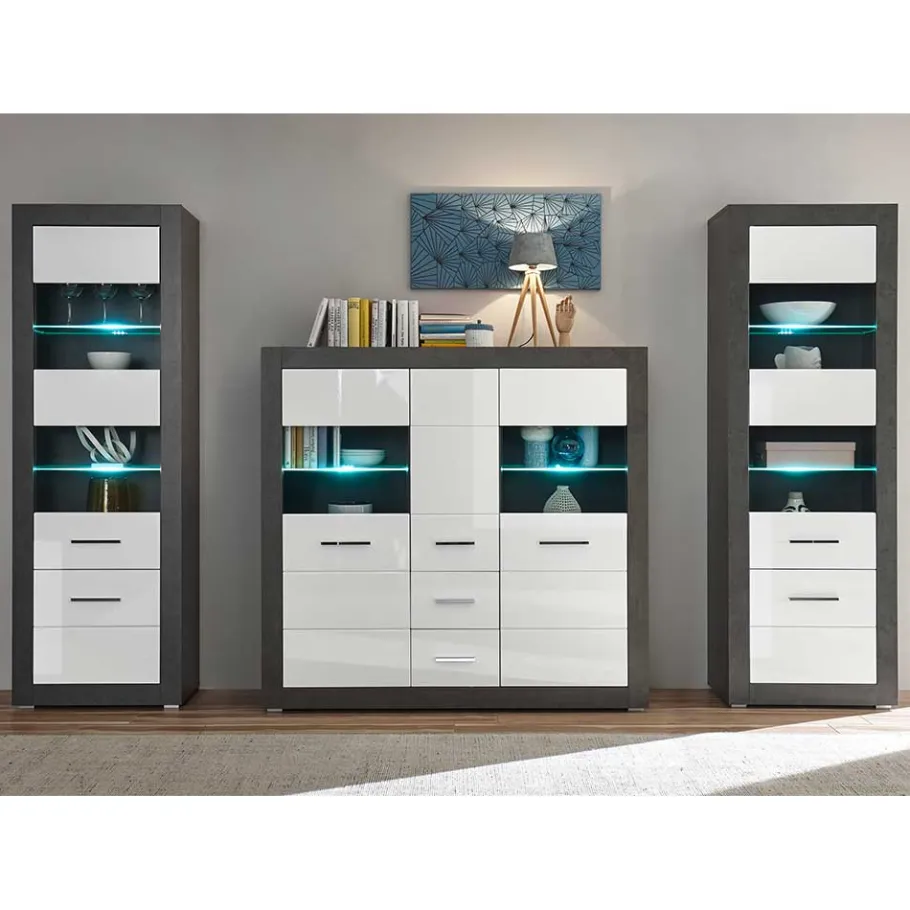 Tauchen Sie ein in eine Welt des modernen Designs und erhabener Eleganz mit unserer Wohnkombination „Istensa“. Diese dreiteilige Kombination besteht aus einem stilvollen Highboard sowie zwei beeindruckenden Standvitrinen, die gemeinsam Ihr Wohnzimmer in ein wahres Design-Meisterwerk verwandeln.