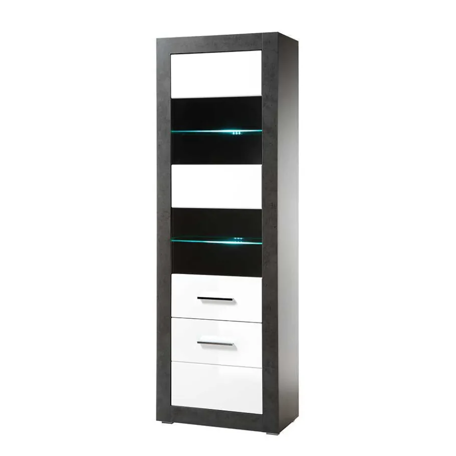 - Front melaminbeschichtet in Weiß Hochglanz, Rahmen, Korpus und Innendekor in Beton Grau