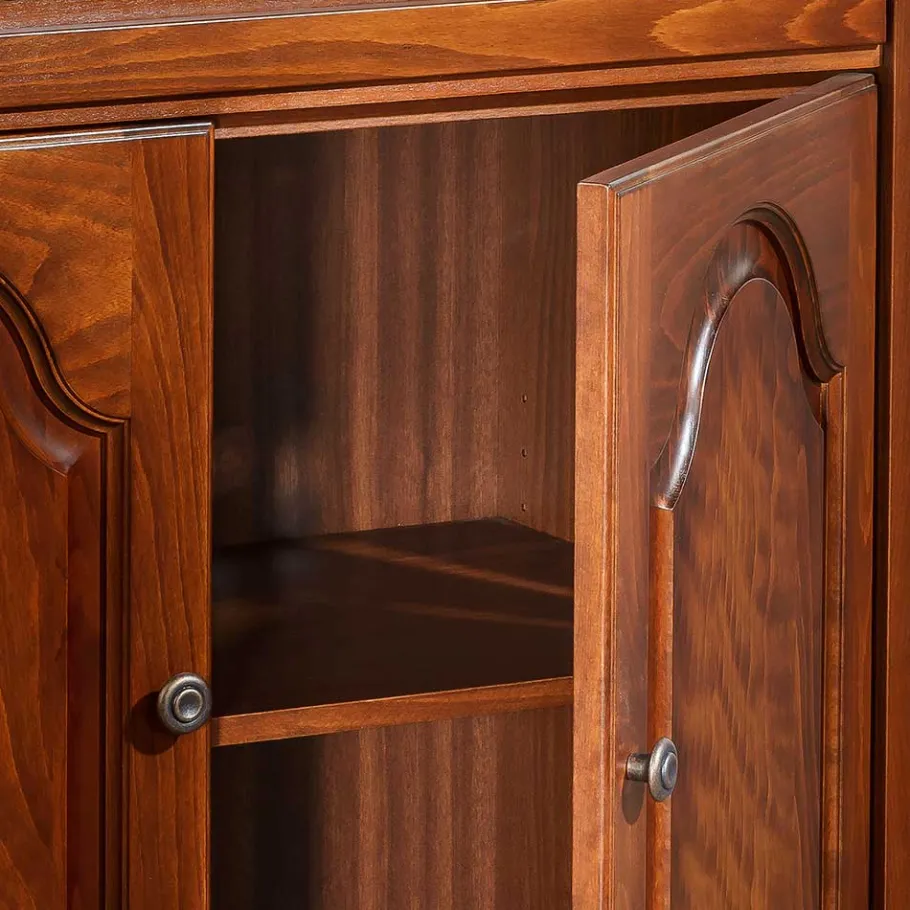 - Massivholz-Oberfläche lackiert und mit Antikfinish patiniert, Holzwerkstoff echtholzfurniert und ebenso behandelt