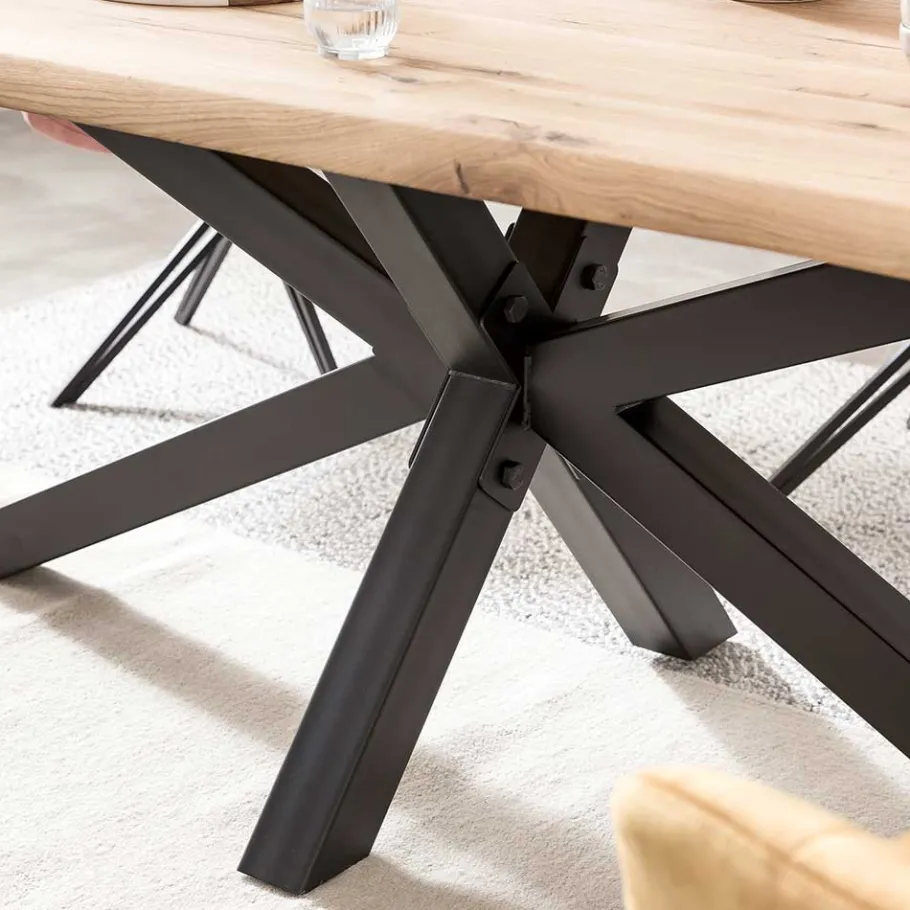 Das schwarze, pulverbeschichtete Metallgestell im Spider-Design verleiht dem Tisch nicht nur enorme Stabilität, sondern auch einen markanten industriellen Charakter. Die massiven Vierkantrohre mit 8×8 cm Stärke wirken robust und doch elegant. Dank der großzügigen Beinfreiheit sitzen Sie und Ihre Gäste bequem, ohne dass störende Tischbeine im Weg sind.