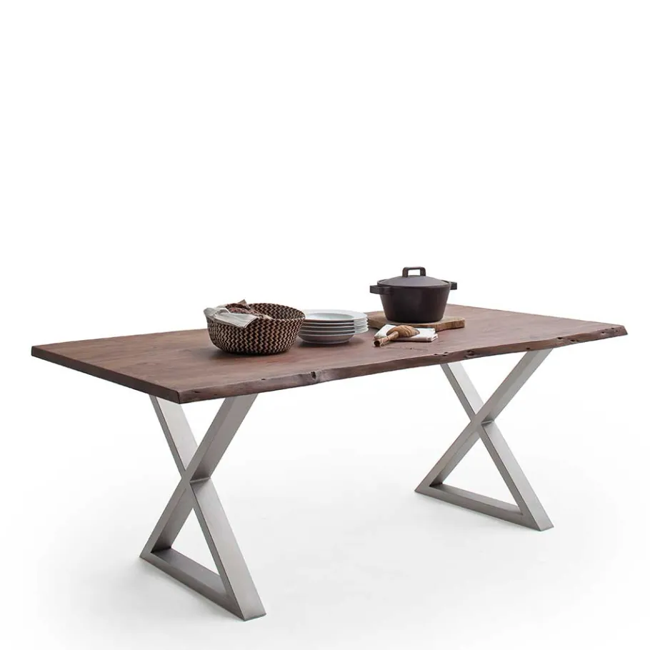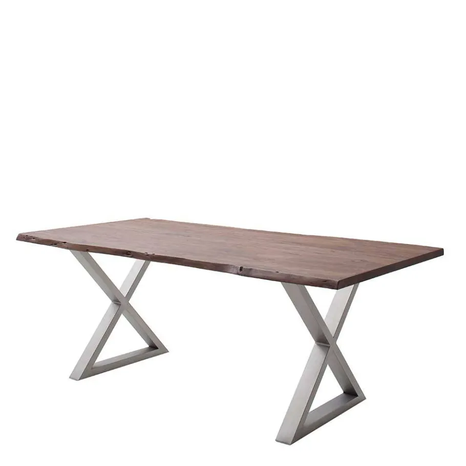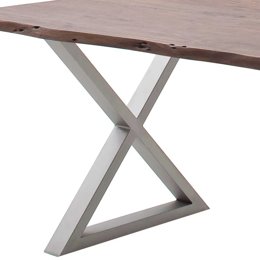 Ein Highlight des Esszimmertisches „Adison“ sind die einzigartigen Naturkanten an den Längsseiten der Tischplatte. Diese Kanten werden direkt aus dem Stamm geschnitten und verleihen jedem Tisch eine individuelle Note. Die Tischplatte hat eine solide Stärke von etwa 3,5 cm und bietet somit eine robuste und stabile Oberfläche. Das stylische Gestell besteht aus zwei X-förmigen Elementen mit breiter Bodenauflage, die für einen sicheren Stand sorgen und gleichzeitig ein optisches Highlight setzen.