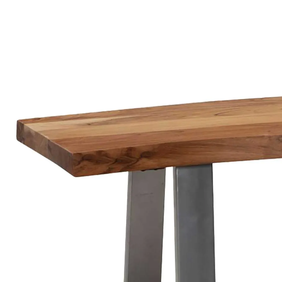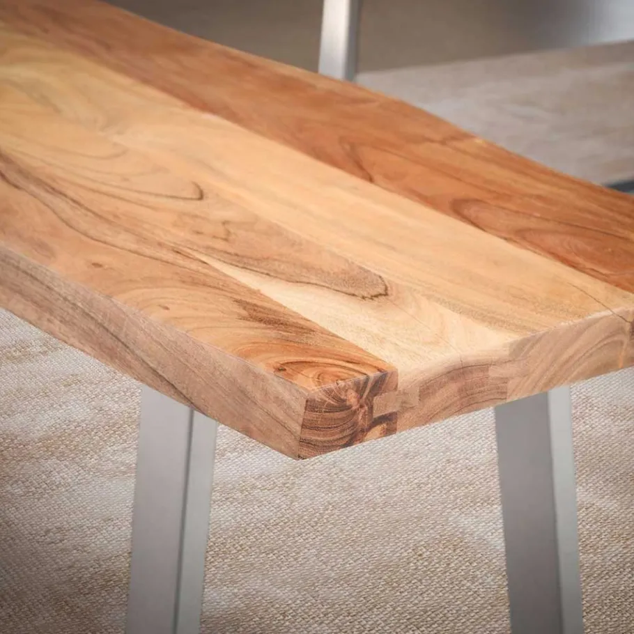 Die Sitzfläche dieser Essbank besteht aus hochwertigem, massivem Akazienholz. Diese Holzart ist nicht nur wegen ihrer robusten Struktur beliebt, sondern auch für ihre warme Farbgebung, die sich harmonisch in viele Einrichtungsstile einfügt. Zusätzlich wurde das Holz mit einer schützenden Lackierung versehen, die es pflegeleicht und langlebig macht. Dank der natürlichen Maserung und der lebendigen Baumkante ist jede Bank ein Unikat, das für eine ganz persönliche Note in Ihrem Zuhause sorgt.