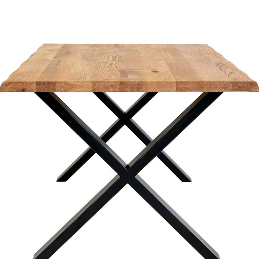 Der Tisch steht auf einem stabilen, schwarzen Stahlgestell in markanter X-Form, das nicht nur ein optisches Statement setzt, sondern auch für maximale Standfestigkeit sorgt. Die pulverbeschichtete Oberfläche schützt das Gestell langfristig vor Kratzern und Korrosion und bewahrt die hochwertige Optik für viele Jahre. Auch die Stühle sind mit einem stabilen Vierfußgestell aus konisch zulaufenden Metallbeinen ausgestattet, die nicht nur robust sind, sondern auch eine leichte, elegante Optik bieten. Diese Kombination aus formschönem Design und praktischer Stabilität garantiert ein langlebiges Möbelstück für Ihren Essbereich.