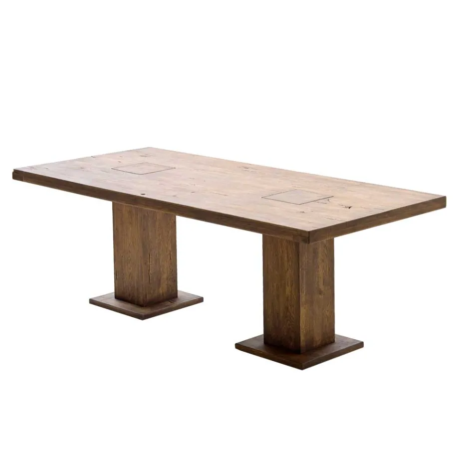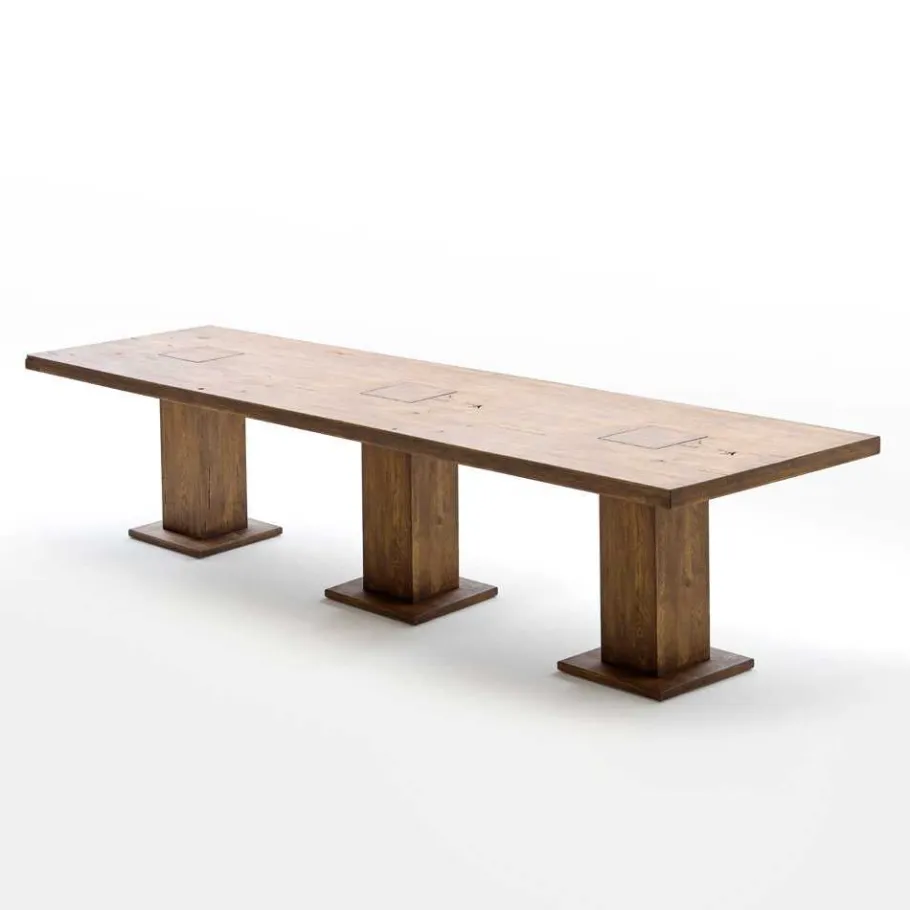 Die Tischplattenstärke beträgt ca. 3 cm und ist an den Seiten auf ca. 6 cm aufgedoppelt. Das solide Säulengestell (innen hohl) ist bei Varianten 004 und 005 mit drei Fußsäulen ausgestattet, wobei die Säulen in der Tischplatte sichtbar sind. Das Ergebnis ist ein einzigartiger Tisch, der höchste Qualität und hochwertige Verarbeitung bietet.