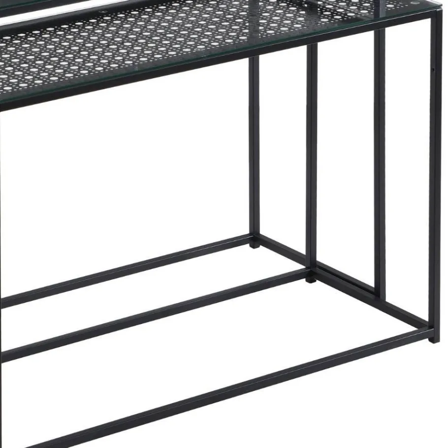 Gefertigt aus robustem Metall und transparentem Sicherheitsglas, vereint das Set Langlebigkeit mit ästhetischer Leichtigkeit. Die schwarze Lackierung der Metalloberflächen verleiht den Tischen eine elegante Tiefe und ist zugleich pflegeleicht sowie widerstandsfähig. Unter den Glasplatten zeigt sich ein faszinierendes Detail: dekorativ gelochte Metallflächen, deren feines Muster aus kleinen runden und größeren sechseckigen Öffnungen besteht – ein subtiler Verweis auf die industrielle Formsprache, die dem Ensemble seine besondere Note gibt.