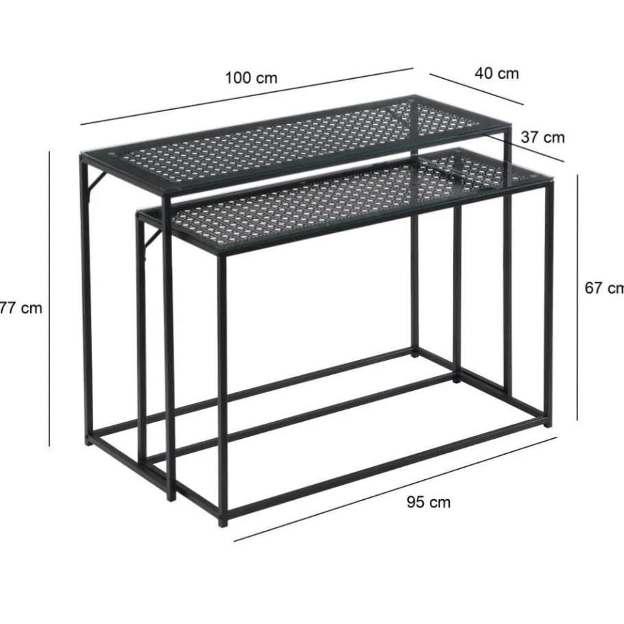 Die beiden Tische sind unterschiedlich hoch konzipiert und lassen sich je nach Bedarf arrangieren oder platzsparend ineinanderschieben. Dieses funktionale Duo überzeugt durch seine Vielseitigkeit – ideal für alle, die Wert auf ein wandelbares Wohnkonzept legen. Das stabile Bügelgestell sorgt für einen sicheren Stand, während die transparente Glasplatte den dunklen Metallflächen eine luftige Leichtigkeit verleiht.