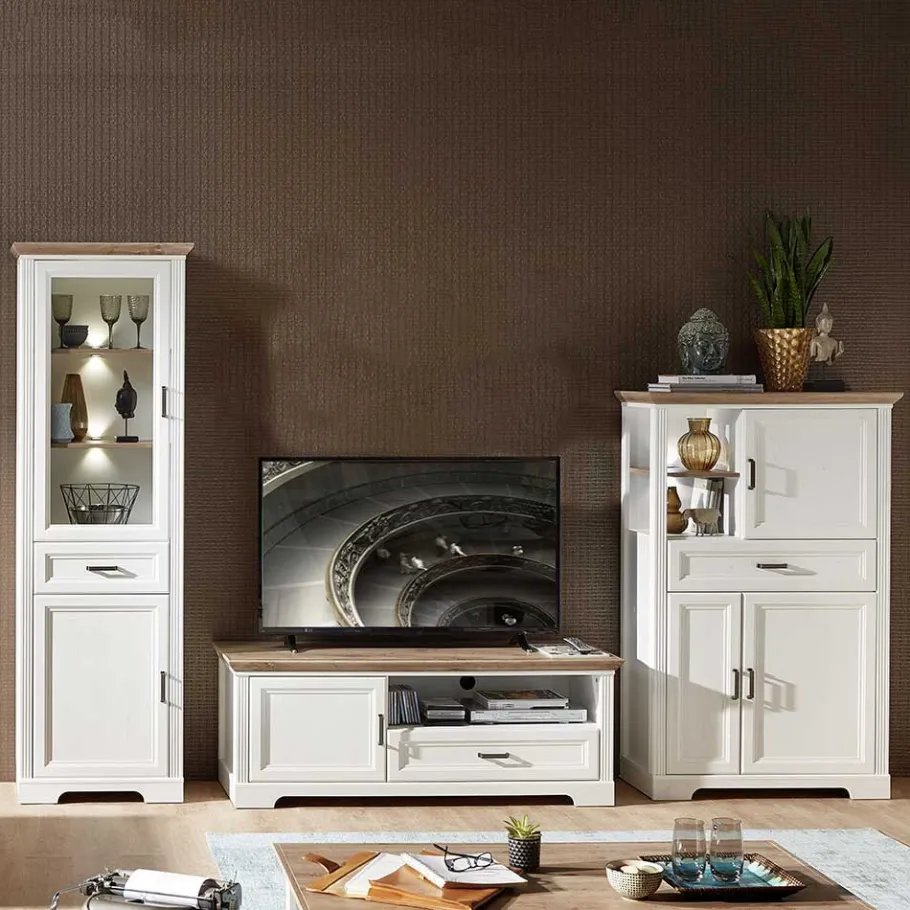 - Ansprechende Wohnwand in Pinie Weiß und Eichefarben