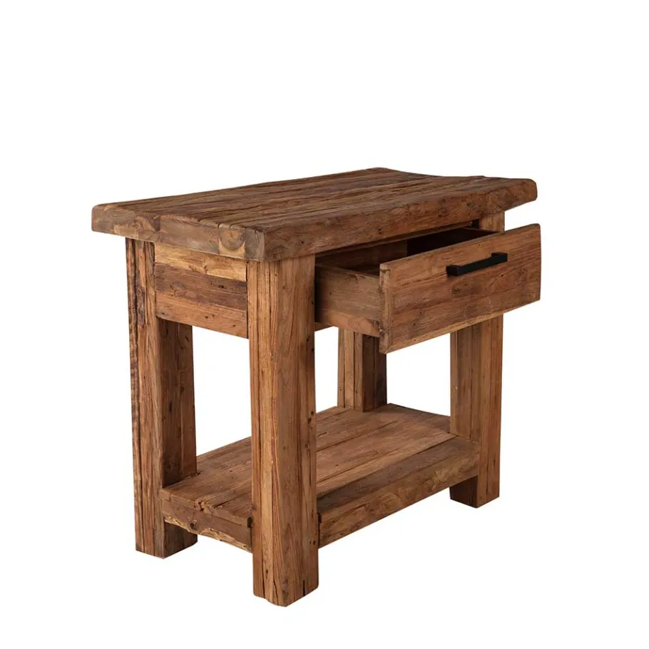 Die massive Tischplatte mit einer Dicke von 6 cm bietet nicht nur eine robuste und stabile Oberfläche, sondern auch ausreichend Platz für Ihre persönlichen Gegenstände. Ein Schubkasten auf rustikalem Holzauszug ermöglicht eine ordentliche Aufbewahrung von kleineren Dingen, während der Bügelgriff aus Metall in Antikoptik einen zusätzlichen Hauch von Vintage-Charme verleiht. Für noch mehr Stauraummöglichkeiten steht Ihnen eine zusätzliche Ablagefläche zur Verfügung, auf der Sie dekorative Elemente oder weitere Utensilien platzieren können.