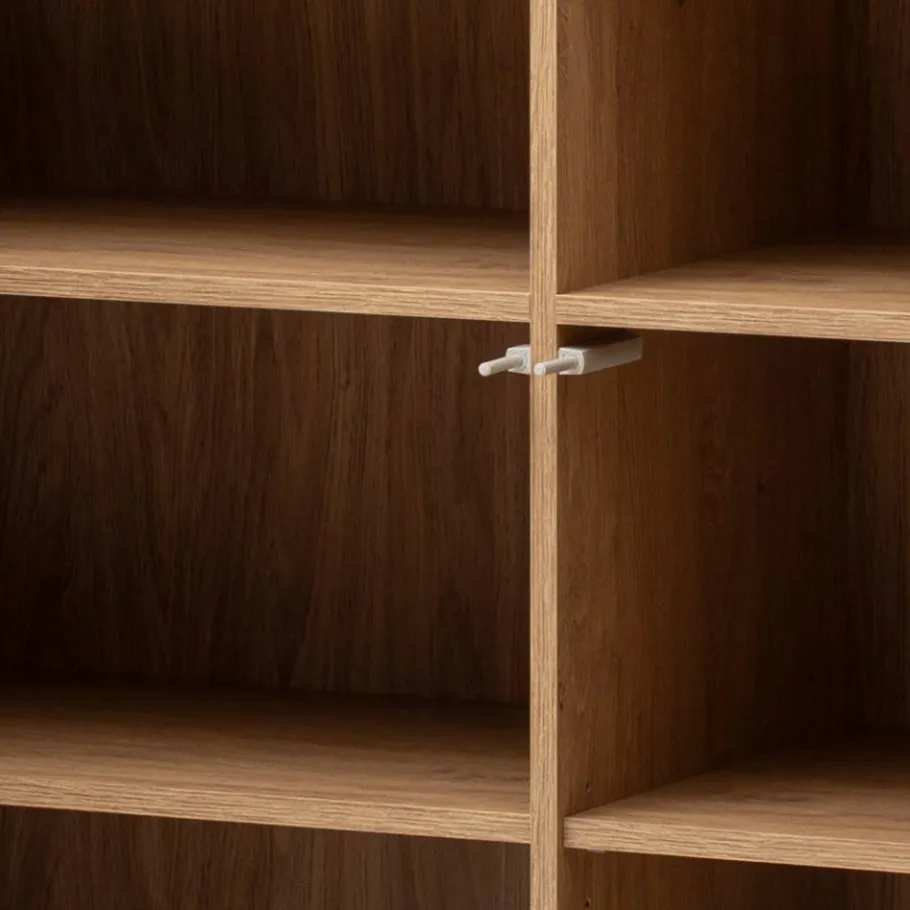 Das Highboard misst 115 cm in der Breite, 137 cm in der Höhe und 40 cm in der Tiefe. Es verfügt über vier Drehtüren, hinter denen sich vier Einlegeböden und zwei Konstruktionsböden befinden. Die strukturierte Innenaufteilung bietet viel Platz für Geschirr, Bücher oder dekorative Elemente – ideal für alle, die Wert auf Übersichtlichkeit und Design legen.