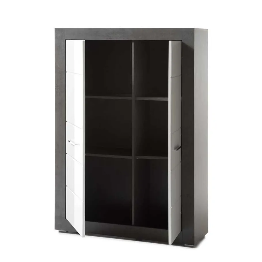 Mit Fronten aus robustem MDF und Korpora aus widerstandsfähiger Spanplatte steht diese Wohnkombination nicht nur für Stil, sondern auch für Haltbarkeit. Die melaminbeschichteten Fronten in strahlendem Weiß Hochglanz, kombiniert mit Rahmen, Korpora und Innendekoren in Beton Grau, erzeugen ein harmonisches Gesamtbild und versetzen jeden Raum in eine moderne und edle Atmosphäre.
