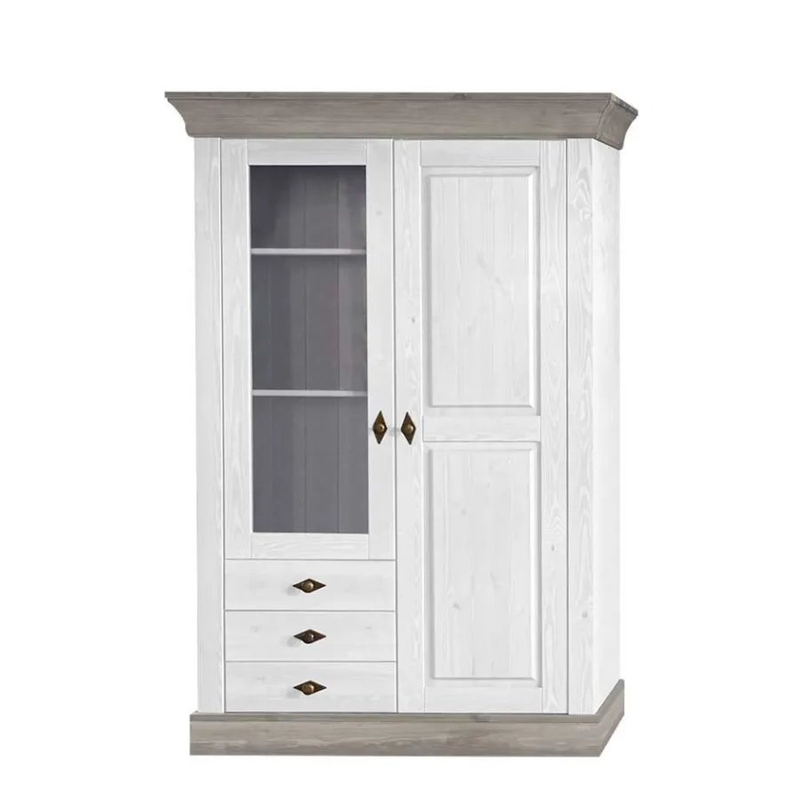 - Mit einer Holztür, einer Glastür und drei Schubladen