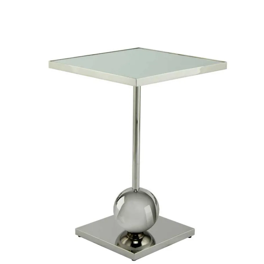 Der Beistelltisch „Lusa“ besticht durch die Kombination aus Spiegelglas und Edelstahl – Materialien, die für ihre Langlebigkeit und ihre pflegeleichten Eigenschaften bekannt sind. Die quadratische Tischplatte aus Spiegelglas reflektiert das Licht und lässt den Raum größer und heller wirken. Die Metall-Einfassung rundet das Design ab und sorgt für eine zusätzliche optische Tiefe. Das auffällige Säulengestell aus Edelstahl wird von einer quadratischen Bodenplatte gestützt und ist mit einem kugelförmigen Dekor-Element versehen – ein Detail, das dem Tisch seine außergewöhnliche Ästhetik verleiht.