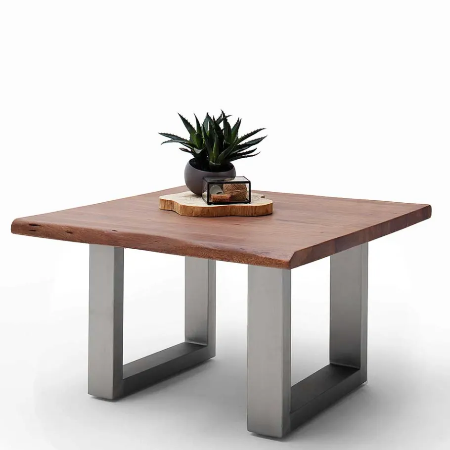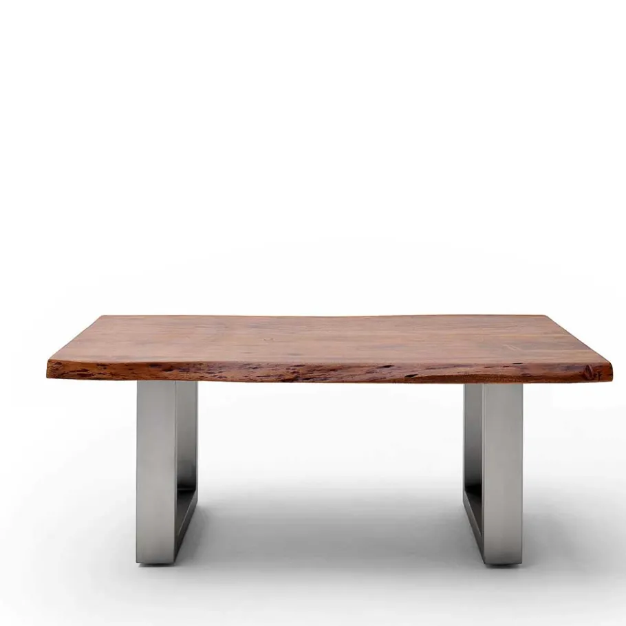 Faszinierend ist der Kontrast zwischen der warmen Holzplatte und dem Gestell aus gebürstetem Edelstahl. Das Metall mit seinem leicht schimmernden, kühlen Silberton wirkt puristisch und modern. Die gebürstete Oberfläche ist nicht nur ästhetisch ansprechend, sondern auch pflegeleicht, da sie unempfindlicher gegenüber Fingerabdrücken ist. Zusammen mit dem Holz schafft der Edelstahl einen ausdrucksstarken Look, der perfekt zum Industrie- und Loft-Stil passt und den Couchtisch „Roccoss“ zum stilvollen Herzstück Ihres Wohnzimmers macht.
