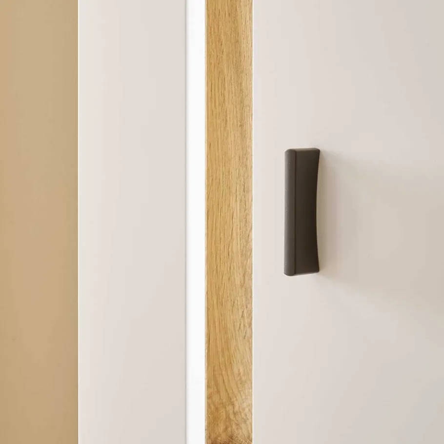 Zeitgemäße Eleganz trifft auf natürliche Akzente – die Wohnwand Racelyn beeindruckt mit ihrer harmonischen Kombination aus strahlendem Weiß und warmen Wildeichefarben. Die klare Linienführung und die filigranen schwarzen Griffleisten aus Metall unterstreichen den modernen Charakter dieser Wohnwand. Die Blenden in Wildeicheoptik setzen charmante Akzente und verleihen dem Gesamtbild eine wohnliche, einladende Note. Dank ihrer Kombination aus stehenden und schwebenden Elementen wirkt die Wohnwand zugleich leicht und großzügig. Hier verschmilzt Design mit Funktionalität zu einem Möbelstück, das Ihr Zuhause bereichert.