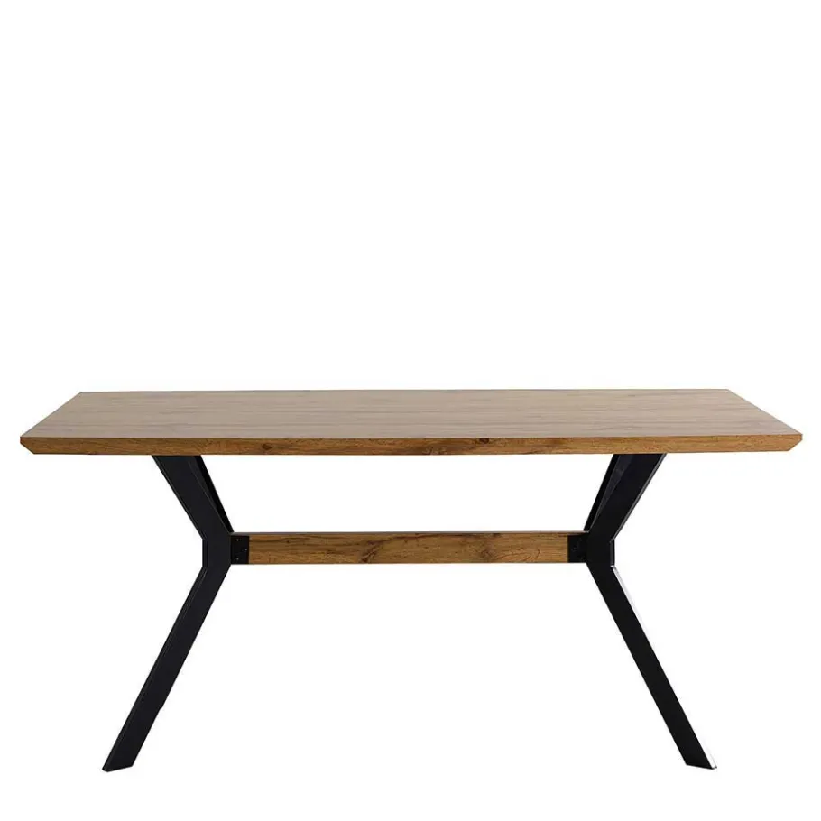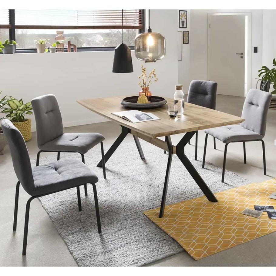 Stabilität bietet das Vierfußgestell aus pulverbeschichtetem Metall, das zusätzlich durch eine Verstrebung in Eichenoptik unterstützt wird. Dieses Designelement bringt nicht nur zusätzliche Standfestigkeit, sondern greift auch visuell die warme Holzoptik der Tischplatte auf – für ein rundum harmonisches Gesamtbild.