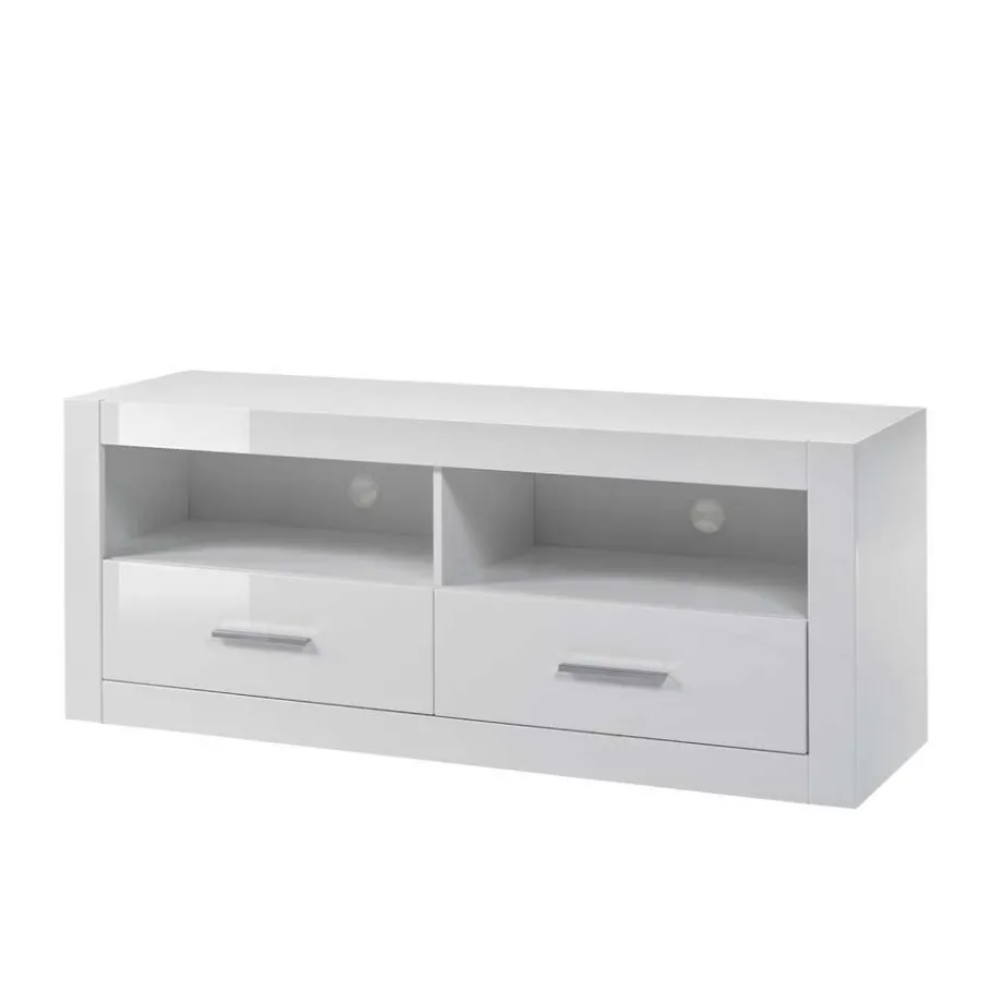 Für Ihre Medientechnik ist das TV-Board (BxHxT: 150x61x45 cm) wie geschaffen. Es trägt Flachbildfernseher bis ca. 65 Zoll (bei Standardmaßen) und hält auf dem Oberboden bis zu 30 kg aus. Zwei großzügige Schubladen mit eleganten, länglichen Metallgriffen bieten Platz für Zubehör, jeweils belastbar bis 5 kg. Im offenen Gerätefach (je ca. 72x27x40 cm) verstauen Sie Receiver, Konsole oder Soundanlage – bis zu 10 kg pro Fachboden sind hier problemlos möglich. Besonders praktisch: Dank Laufrollen lässt sich das Lowboard mühelos verschieben, ohne dass der Boden leidet.