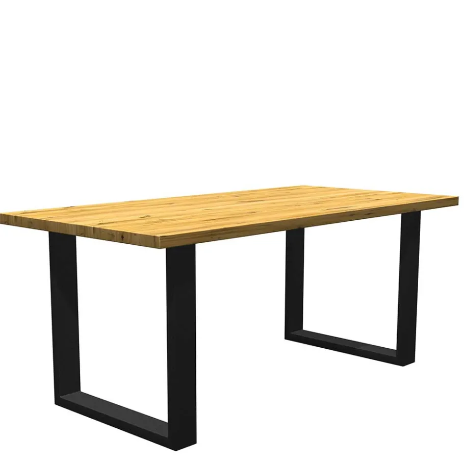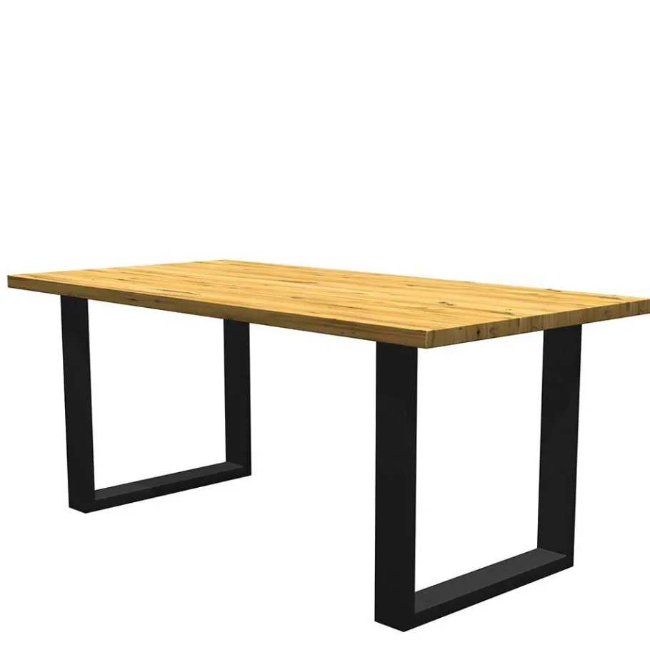 Herz des Industrial Esstisches Binia ist eine Platte aus massivem Eichenholz in einer sehr soliden Stärke von etwa 4 cm mit geraden Kanten. Als Unterbau diesen zwei markante Metall-Bügel im U-Design, welche für den kühlen Industrial Charme dieses Tisches verantwortlich sind.