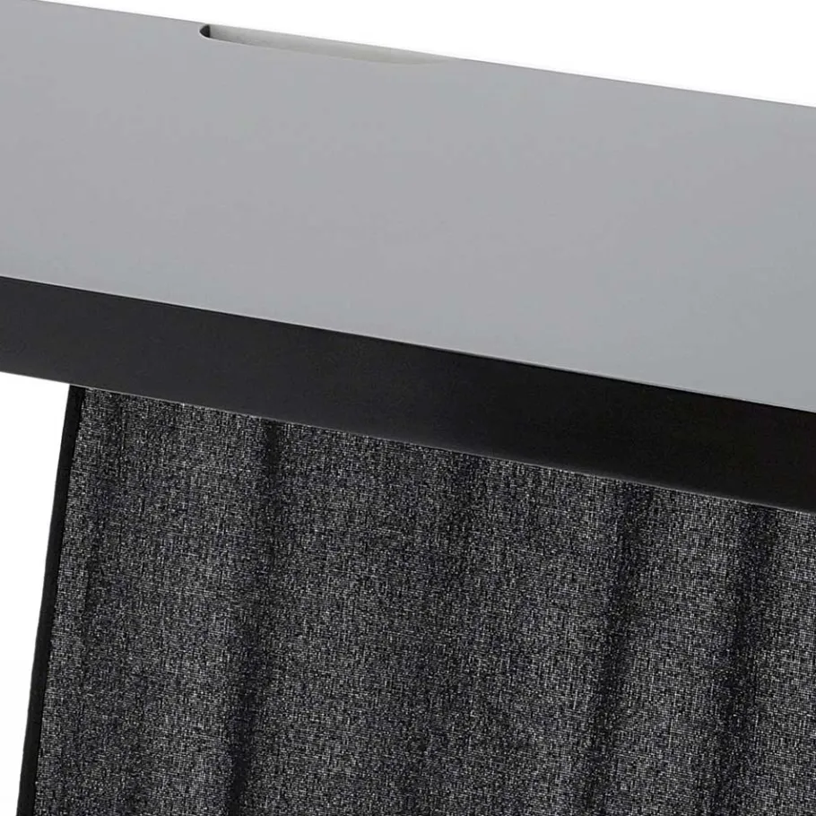 Der Schreibtisch Tulcea ist mit einer schwarzen Knieraumblende aus Windschutz-Gewebe (100% Polypropylen) ausgestattet, die für zusätzlichen Komfort sorgt. An beiden Enden der Tischplatte befinden sich zwei Kabeldurchlässe, die Ihnen ermöglichen, Ihre Kabel ordentlich zu verlegen und für eine aufgeräumte Arbeitsfläche zu sorgen.