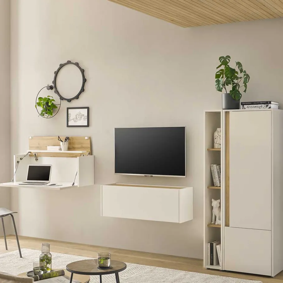 - Topaktuelle Wohnwand in Weiß und Wildeichefarben