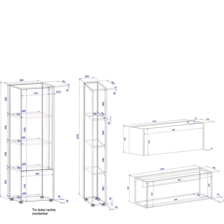 - Wandmontage sowie flache Kunststoffgleiter, eine zusätzliche Kippsicherung ist bei den hohen Möbeln erforderlich