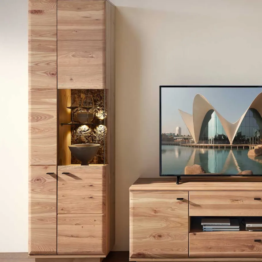 Die Fronten der Wohnwand „Cassna“ bestehen aus massivem Eschenholz, das für seine Widerstandsfähigkeit und seine edle Optik bekannt ist. Eschenholz bietet nicht nur eine langlebige und robuste Oberfläche, sondern auch eine natürliche Schönheit, die jedes Stück einzigartig macht. Der Korpus besteht aus MDF, das mit einer Folierung in Holzoptik Wildeiche veredelt wurde. Dieses Verfahren sorgt für eine realistische Holzstruktur und erhöht die Widerstandsfähigkeit des MDF gegenüber Feuchtigkeit und Kratzern. Die durchgehenden Lamellen der Fronten heben sich hervor und tragen zur optischen Harmonie bei, indem sie eine gleichmäßige und elegante Holzoberfläche bieten.