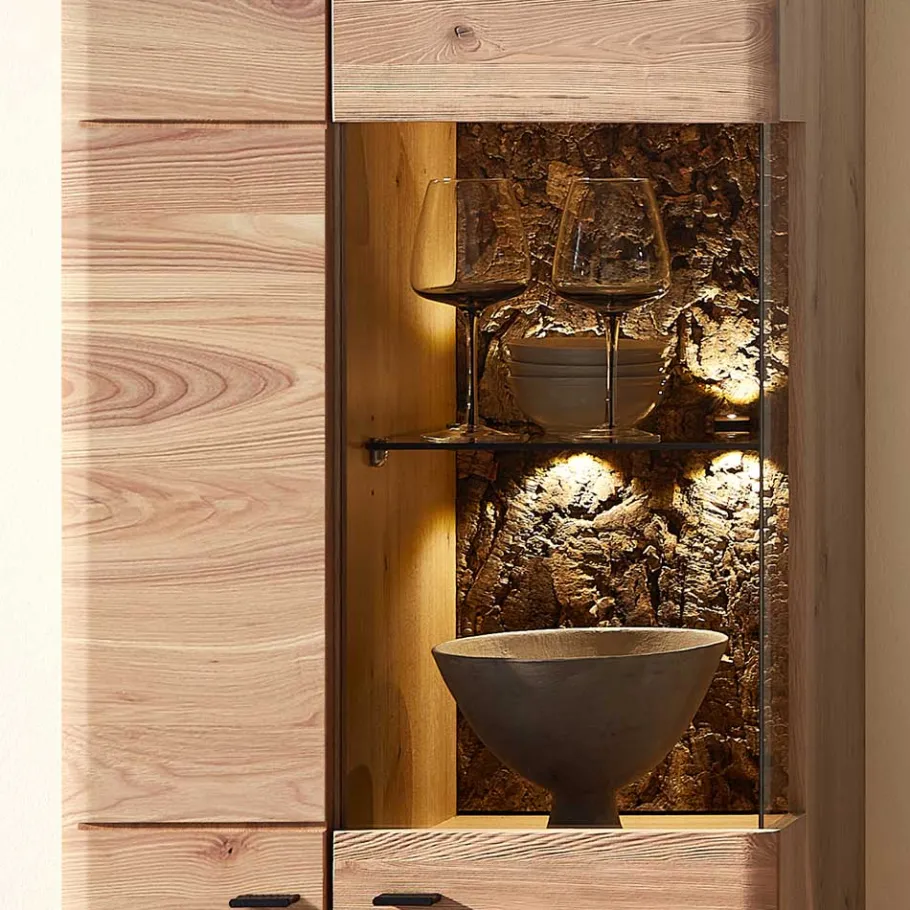 Moderne Designs zeichnen sich durch klare Linien, funktionale Ästhetik und zeitlose Eleganz aus. Die Wohnwand „Cassna“ verkörpert genau diese Designphilosophie und kombiniert es mit exquisiten Materialien. Die Vitrine, das TV-Board und das Wandpaneel in einem geschmackvollen Zusammenspiel aus Esche- und Wildeichefarben setzen ein stilvolles Statement in Ihrem Wohnbereich. Eschenholzfronten und MDF-Korpusse in Holzoptik Wildeiche sorgen für ein ansprechendes und gleichzeitig pflegeleichtes Möbelstück, das perfekt in jede moderne Einrichtung passt.