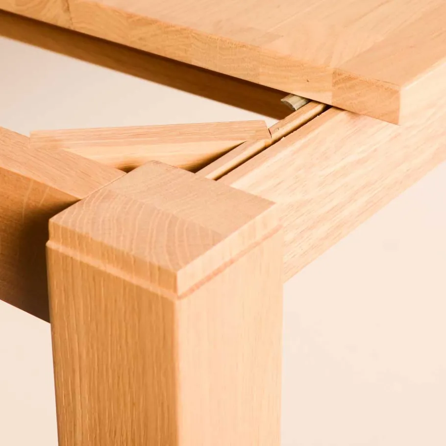 Mit seinem Front-Kulissenauszug ist der Tisch ohne großen Aufwand verlängerbar, indem Sie spielend einfach eine oder zwei Einlegeplatten von je 50 cm Breite hinzufügen (je nach gewählter Breite).