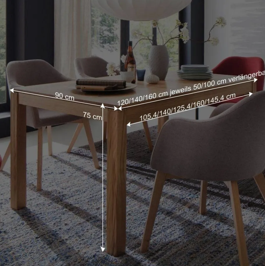 Der Tisch verfügt über eine solide Tischplattenstärke von ca. 2 cm und ist stabverleimt, um maximale Stabilität zu gewährleisten. Das starke Massivholz-Vierfußgestell mit Tischbeinen von ca. 7×7 cm sorgt für zusätzliche Stabilität und Unterstützung. Der Abstand vom Boden bis zur Unterkante der Zarge beträgt ca. 64,5 cm, während der Abstand zwischen den Tischbeinen an der Längsseite bei einer Breite von 120 cm ca. 105,4 cm, bei 140 cm ca. 125,4 cm und bei 160 cm ca. 145,4 cm beträgt.